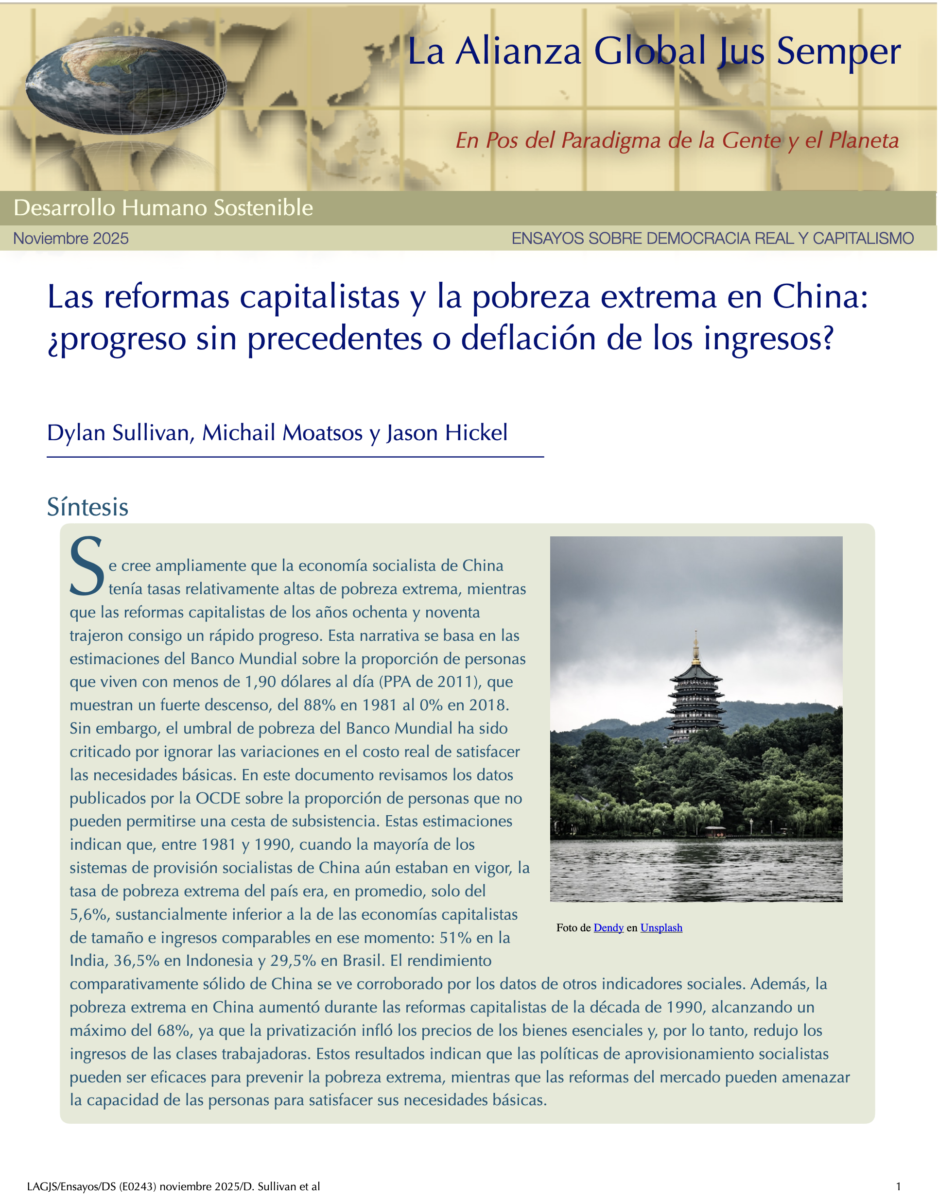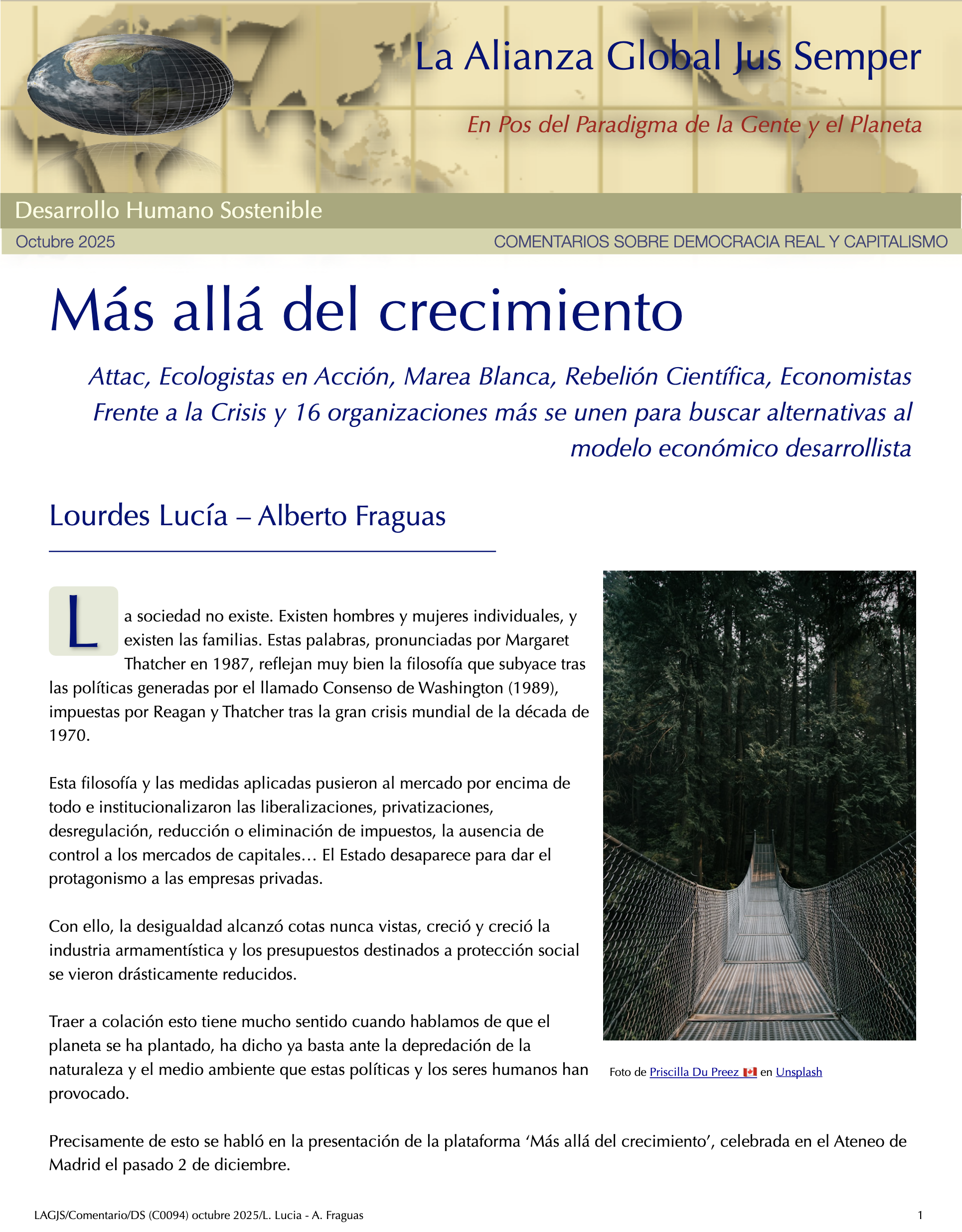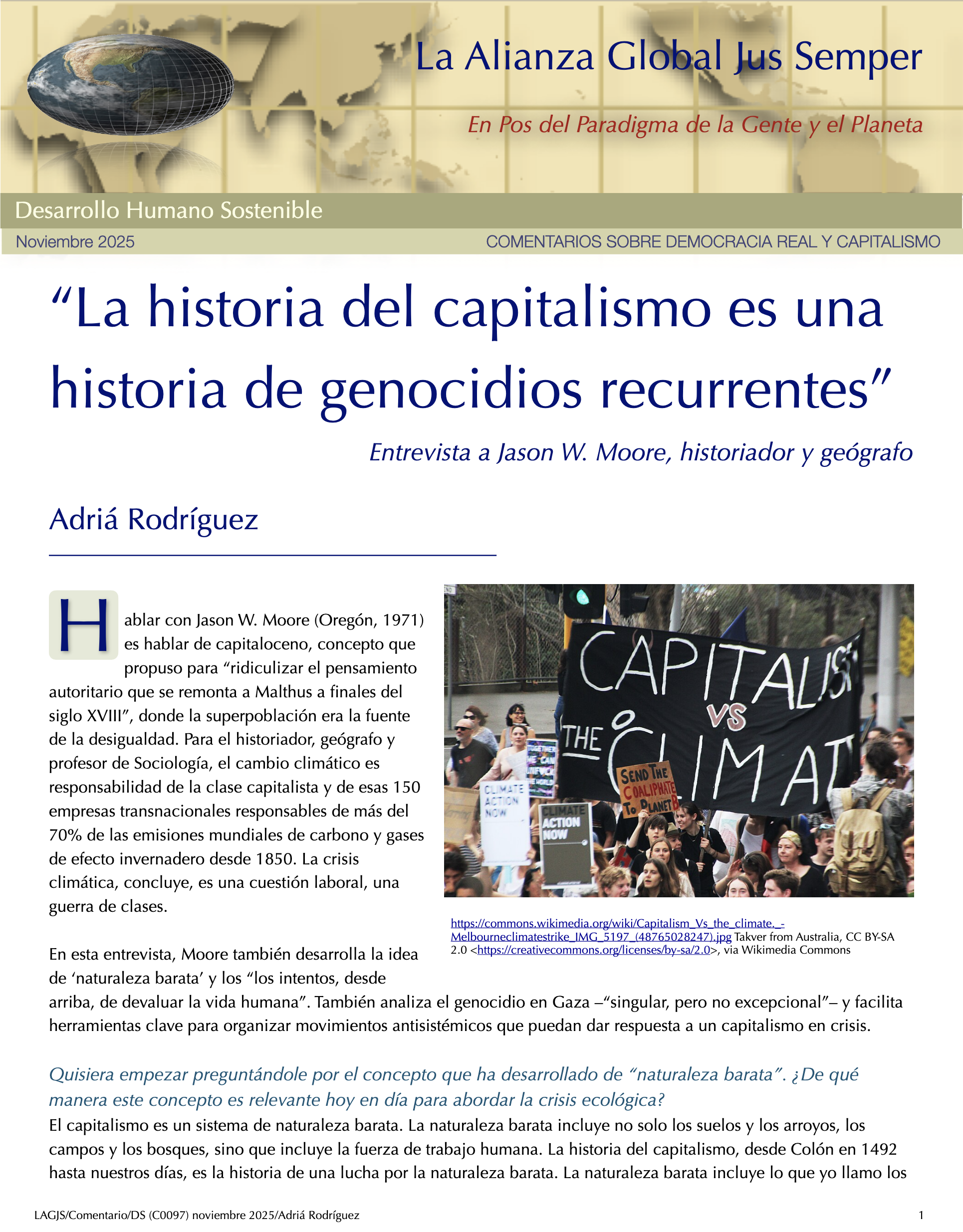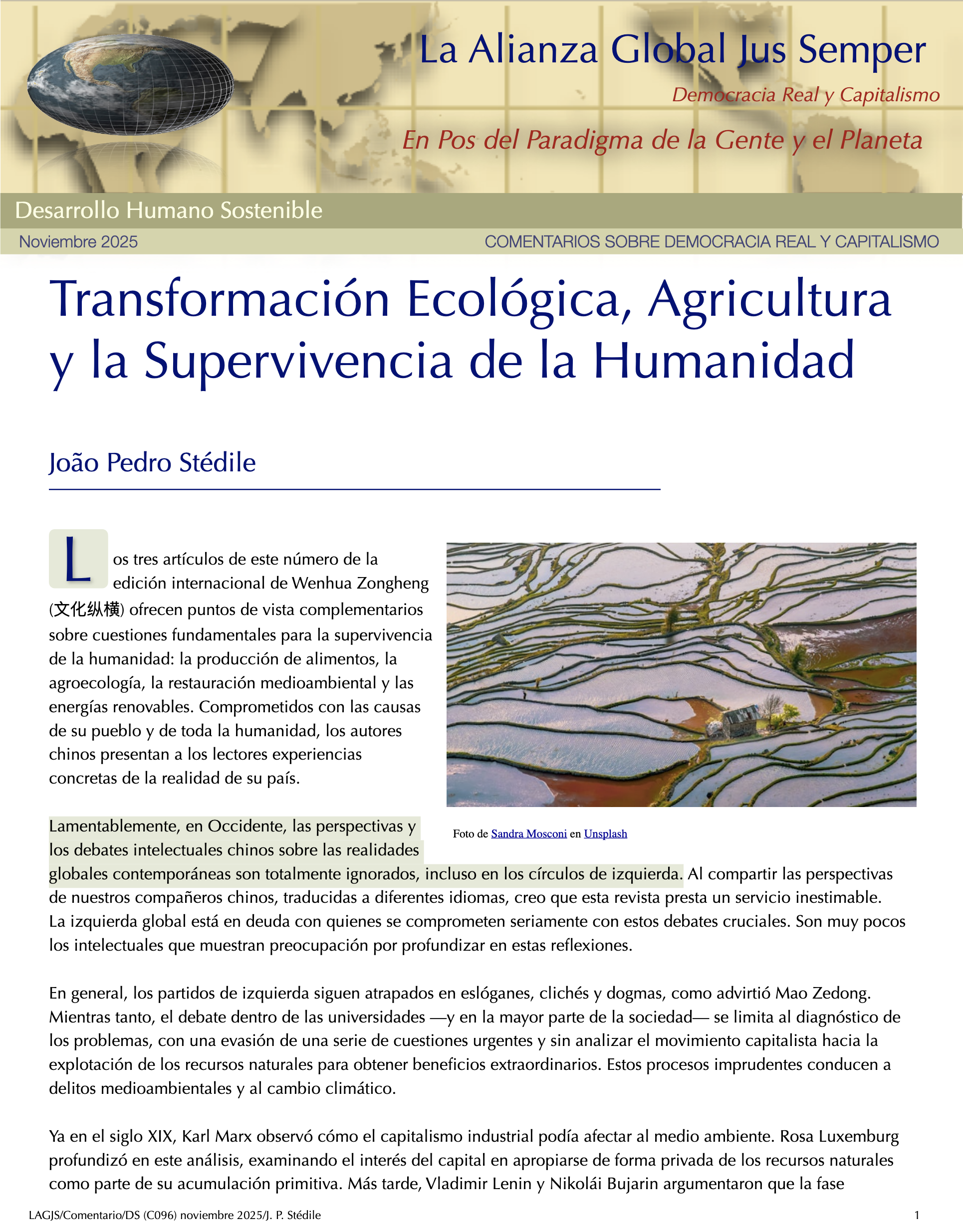 Transitando a Geocracia — Paradigma de la Gente y el Planeta y No el Mercado — Primeros PasosPartiendo del hecho de que salvar el planeta Tierra, nuestro hogar, cambia todo, necesitamos construir un nuevo ethos en el que la mayoría de la humanidad se comprometa con un sistema cuyo único propósito sea la búsqueda del bienestar de las personas y el planeta Tierra. Esto requiere que todos los recursos de la tierra necesarios para el disfrute de la vida de todos los seres vivos se gestionen para lograr una verdadera sostenibilidad a largo plazo. — Álvaro de Regil Castilla La Insoportable Falta de Conciencia de Nuestra Crisis Ecológica ExistencialEn los últimos dos años, el informe completo sobre la Mitigación del Cambio Climático elaborado por los científicos del IPCC, así como las investigaciones de otros centros, como el Centro de Resiliencia de Estocolmo, han confirmado sistemáticamente que seguimos una trayectoria fatal. A menos que viremos rápidamente en la dirección contraria, las probabilidades de que nos enfrentemos a catástrofes planetarias que pongan en grave riesgo la existencia de vida en nuestro planeta en los próximos veinte años son realistas y probables. El insostenible capitalismo nos mantiene engañados y mayormente inconscientes de estar al borde de un grave riesgo existencial. Por ello el gran reto es provocar la toma de conciencia y el pensamiento crítico del ciudadano común. Sólo una revolución ciudadana podrá construir un nuevo paradigma en beneficio de la gente y el planeta y no el mercado. –– Álvaro de Regil Castilla La Tierra más allá de seis de los nueve límites planetariosLa actualización del marco de los límites planetarios revela que se han transgredido seis de los nueve límites, lo que sugiere que la Tierra se encuentra ahora fuera del espacio operativo seguro para la humanidad. La acidificación de los océanos está a punto de traspasarse, mientras que la carga de aerosoles supera regionalmente el límite. Los niveles de ozono estratosférico se han recuperado ligeramente. El nivel de transgresión ha aumentado para todos los límites anteriormente identificados como sobrepasados. Dado que la producción primaria impulsa las funciones de la biosfera del sistema Tierra, se propone la apropiación humana de la producción primaria neta como variable de control de la integridad funcional de la biosfera. Este límite también se ha transgredido. La modelización del sistema Tierra de diferentes niveles de transgresión de los límites del cambio climático y del sistema Tierra ilustra que estos impactos antropogénicos sobre el sistema Tierra tienen que considerarse en un contexto sistémico. —Katherine Richardson et al Transferencia de Valor y Arbitraje Laboral Basado en El Intercambio Desigual: El Caso de México – Estados UnidosEl intercambio desigual es un concepto clave en las críticas marxistas al capitalismo global, que propone que el desarrollo desigual está impulsado por la retención por parte del núcleo de una parte sustancial del valor producido en la periferia. Hoy en día, la desigualdad y las transferencias de valor se deben a que las multinacionales trasladan la producción a países periféricos, donde se alcanzan niveles de productividad similares, pero las disparidades salariales no hacen más que aumentar. Este estudio destaca que las disparidades salariales son cruciales para la acumulación del capital monopolista, lo que da lugar a salarios reducidos y condiciones sociales precarias en México, con un drenaje de valor del trabajo de 135 millardos de dólares en 2023, lo que representa el 7,5% de su PIB. —Mateo Crossa Niell - Álvaro de Regil Castilla Post-crecimiento: la ciencia del bienestar dentro de los límites planetariosExiste una creciente preocupación de que el crecimiento económico continuo en los países de altos ingresos pueda no ser ambientalmente sostenible, socialmente beneficioso o económicamente alcanzable. En esta revisión, exploramos el campo de la investigación sobre el postcrecimiento, que avanza rápidamente y ha evolucionado en respuesta a estas preocupaciones. La idea central del post-crecimiento es reemplazar el objetivo de aumentar el PIB por el de mejorar el bienestar humano dentro de los límites del planeta. Entre los avances clave que se analizan se incluyen: el desarrollo de modelos macroeconómicos ecológicos que ponen a prueba las políticas de gestión sin crecimiento; la comprensión y reducción de las dependencias del crecimiento que vinculan el bienestar social al aumento del PIB; y la caracterización de las políticas y sistemas de abasto que permitirían reducir el uso de recursos y mejorar el bienestar humano. —Giorgos Kallis et al Los Límites Seguros y Justos del Sistema TierraLa humanidad se encuentra bien adentrada en el Antropoceno, la nueva época geológica propuesta en la que las presiones humanas han puesto al sistema Tierra en una trayectoria que se aleja rápidamente del estado estable del Holoceno de los últimos 12.000 años, que es el único estado del sistema Tierra del que tenemos pruebas de que puede sustentar el mundo tal y como lo conocemos. Siete de los ocho límites cuantificados a escala mundial ya se han superado. Estos se proponen como la base para salvaguardar los bienes comunes globales para todas las personas, ahora y en el futuro. — Johan Rockström et al El intercambio desigual del trabajo en la economía mundialLos investigadores han argumentado que las naciones ricas dependen de una gran apropiación neta de mano de obra y recursos del resto del mundo a través del intercambio desigual en el comercio internacional y las cadenas mundiales de productos básicos. Aquí evaluamos esto empíricamente midiendo los flujos de mano de obra incorporada en la economía mundial entre 1995 y 2021, teniendo en cuenta los niveles de cualificación, los sectores y los salarios. En 2021, las economías del Norte global se apropi