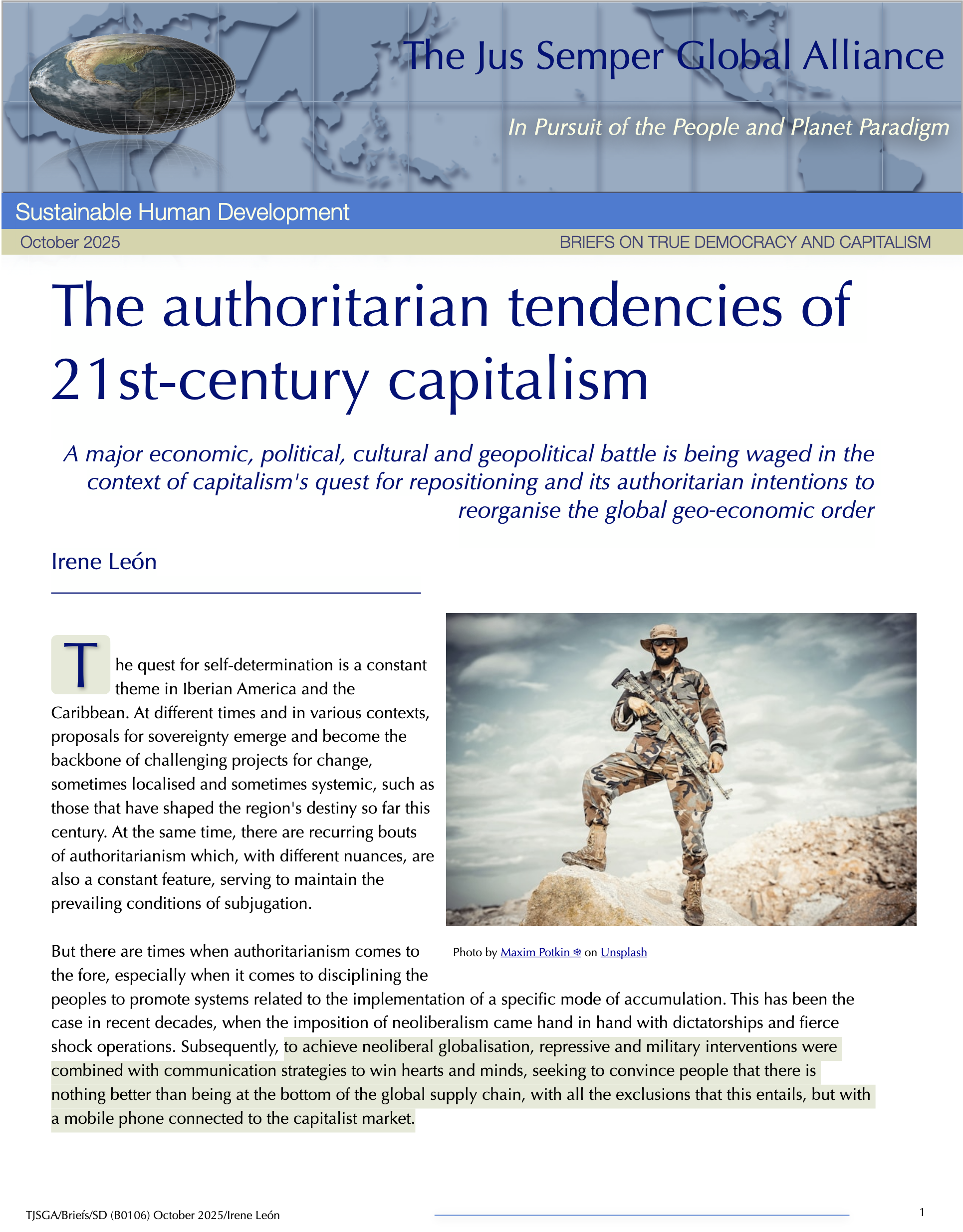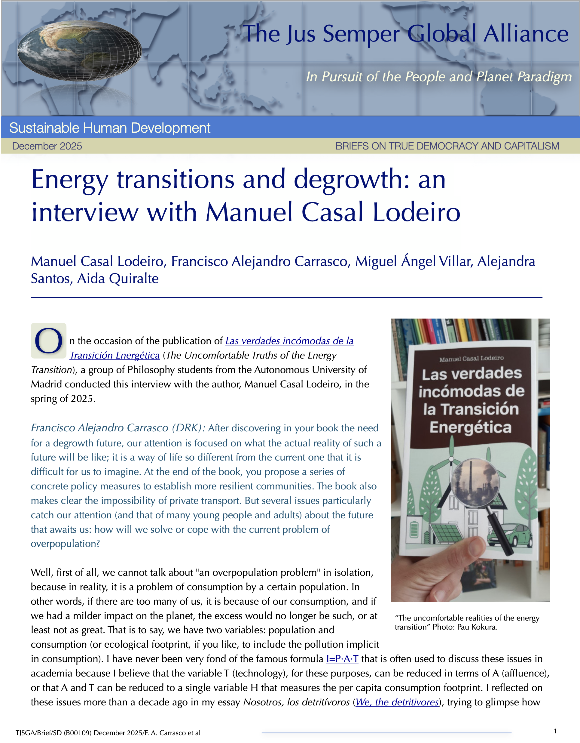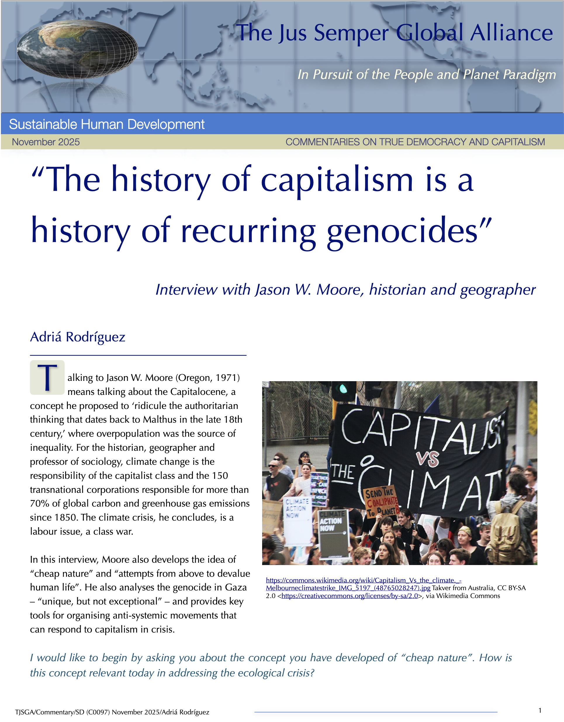 Transitioning to Geocratia — the People and Planet and Not the Market Paradigm — First StepsParting from the fact that saving Planet Earth, our home, changes everything, we need to build a new ethos where the majority of humankind commits to a system whose only purpose is the pursuit of the welfare of people and Planet Earth. This requires that all Earth resources necessary for the enjoyment of life of all living things be managed to achieve true long-term sustainability. — Álvaro J. de Regil The Unbearable Unawareness of our Ecological Existential CrisisOver the past two years, the full report on Climate Change Mitigation by IPCC scientists, as well as research from other centres such as the Stockholm Resilience Centre, has consistently confirmed that we are on a doomsday trajectory. Unless we move rapidly in the opposite direction, the chances that we will face planetary catastrophes that seriously threaten the existence of life on our planet in the next twenty years are realistic and probable. Unsustainable capitalism keeps us deluded and largely unaware that we are on the brink of a serious existential risk. Therefore the great challenge is to provoke the awareness and critical thinking of ordinary citizens. Only a Citixens Revolution can stop our demise, but capitalism’s behemoth keeps people deceitful and mostly unaware of being on the verge of a catastrophic end. We must arouse Now! –– Álvaro J. de Regil Earth beyond six of nine planetary boundariesThe update of the planetary boundaries framework reveals that six of the nine boundaries have been transgressed, suggesting that the Earth is now outside the safe operating space for humanity. Ocean acidification is about to be exceeded, while aerosol loading exceeds the limit regionally. Stratospheric ozone levels have recovered slightly. The transgression level has increased for all boundaries previously identified as exceeded. Given that primary production drives the biosphere functions of the Earth system, human appropriation of net primary production is proposed as a control variable for the functional integrity of the biosphere. This boundary has also been transgressed. Modeling the Earth system with different levels of transgression of climate change and Earth system boundaries illustrates that these anthropogenic impacts on the Earth system must be considered in a systemic context. —Katherine Richardson et al Controversial Demographic Projections Under Climate Collapse in 2050 - South and Mesoamerica in a Global ContextThe corporate sector is building another aggressive re-engineering of global agrifood systems in South America and Mesoamerica. The region represents a pillar for global food security, warns the UN in the New Mission. Capitalist euphoria assumes 10 billion inhabitants by 2050. This is forging higher agricultural productivity, innovation, digitalisation and the expansion of standardised agriculture. Thus, they produce and market food destined for populations with some or enough consumption capacity, overconsumption and waste of food with equivalent carbon footprints. –– Nubia Barrera Silva The pressing priority of saving the AmazoniaThe world's most biodiverse region is threatened by deforestation levels close to the point of no return. Despite this, the countries involved failed to reach agreements at the last summit in Brazil in August. –– David Roca Basadre Safe and Just Earth System BoundariesHumanity is well into the Anthropocene, the proposed new geological epoch where human pressures have put the Earth system on a trajectory moving rapidly away from the stable Holocene state of the past 12,000 years, which is the only state of the Earth system we have evidence of being able to support the world as we know it. Seven of eight globally quantified safe and just Earth System Boundaries (ESB) and at least two regional safe and just ESBs in over half of global land area are already exceeded. We propose that our assessment provides a quantitative foundation for safeguarding the global commons for all people now and into the future. — Johan Rockström et al ‘The energy transition has not yet begun’Interview with Jean-Baptiste Fressoz (France, 1977), historian of science, technology, and the environment, and professor at the School for Advanced Studies in the Social Sciences in Paris. He has just published Without Transition: A New History of Energy (Seuil), which will be translated and published in Spanish by Arpa. He is also the co-author, with Christophe Bonneuil, of The Anthropocene Event: The Earth, History, and Us (Points Histoire) and The Joyful Apocalypse: A History of Technological Risk (Seuil). —Hervé Kempf Community-Based Adaptation to Climate Change: Core Issues and Implications for Practical ImplementationsAccording to current forecasts, global heating is likely to exceed 2.8 °C by the end of this century. This makes substantial adaptation measures necessary to secure a broad basis for livelihood provision and the conservation of biodiversity. While the implementation of top-down and technocratic adaptation efforts predominates, related adaptation shortcomings of a socio-economic and ecological nature are becoming more and more apparent. Community-based adaptation (CBA), with its participatory, inclusive and needs-based bottom-up approach, offers a promising and powerful alternative. This article uses a semi-systematic literature review approach to screen the current literature and identify core issues of CBA. ––Tom Selje et al Capitalism and Extreme Poverty: A Global Analysis of Real Wages, Human Height, Mortality Since the Long 16th CenturyThis paper assesses claims that, prior to the 19th century, around 90% of the human population lived in extreme poverty (defined as the inability to access essential goods), and that global human welfare only began to improve with the rise of capitalism. The rise of capitalism caused a dramatic deterioration of human welfare. In a