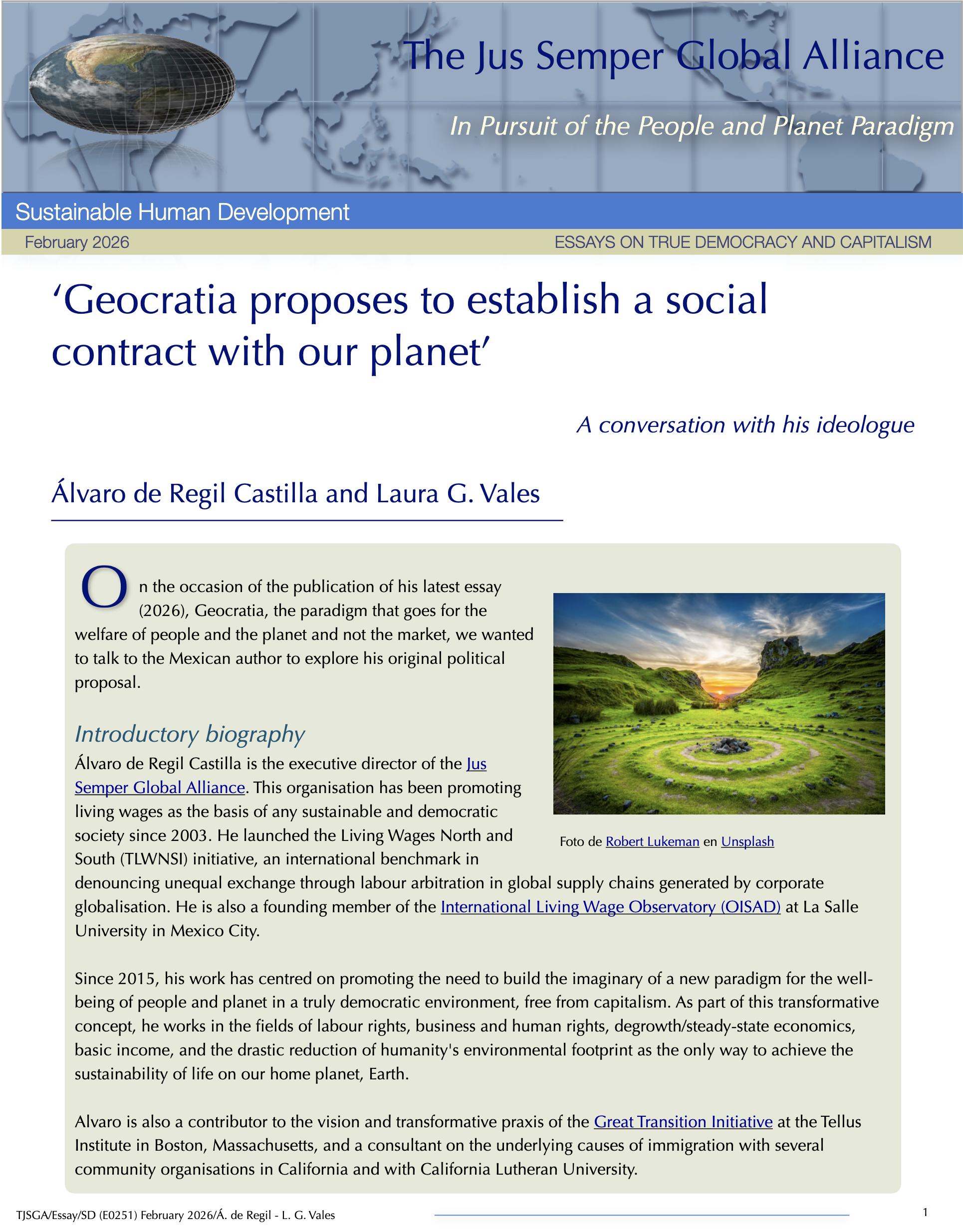 Álvaro de Regil Castilla is the executive director of the Jus Semper Global Alliance. This organisation has been promoting living wages as the basis of any sustainable and democratic society since 2003. He launched the Living Wages North andSouth (TLWNSI) initiative, an international benchmark in denouncing unequal exchange through labour arbitration in global supply chains generated by corporate globalisation. He is also a founding member of the International Living Wage Observatory (OISAD) at La Salle University in Mexico City.