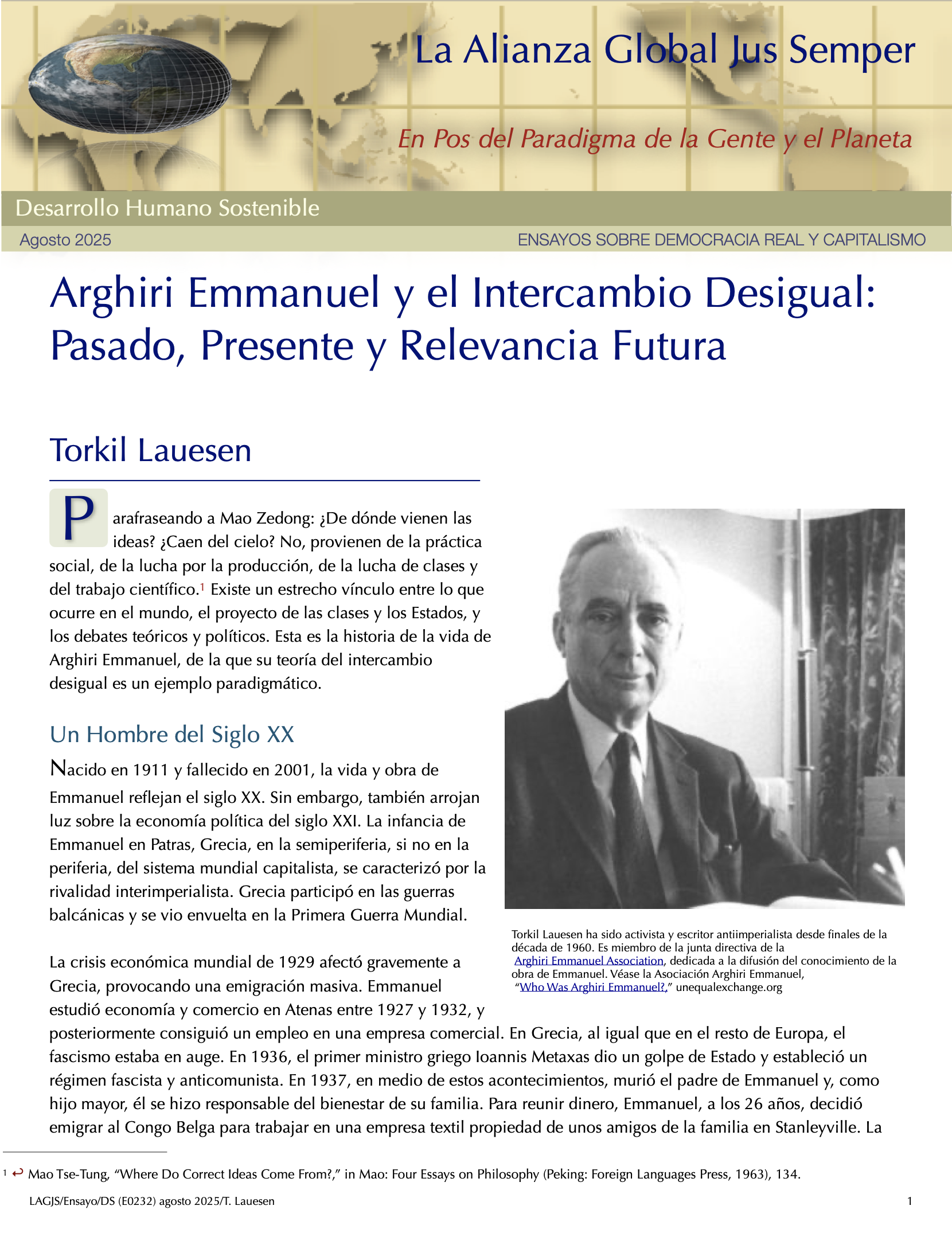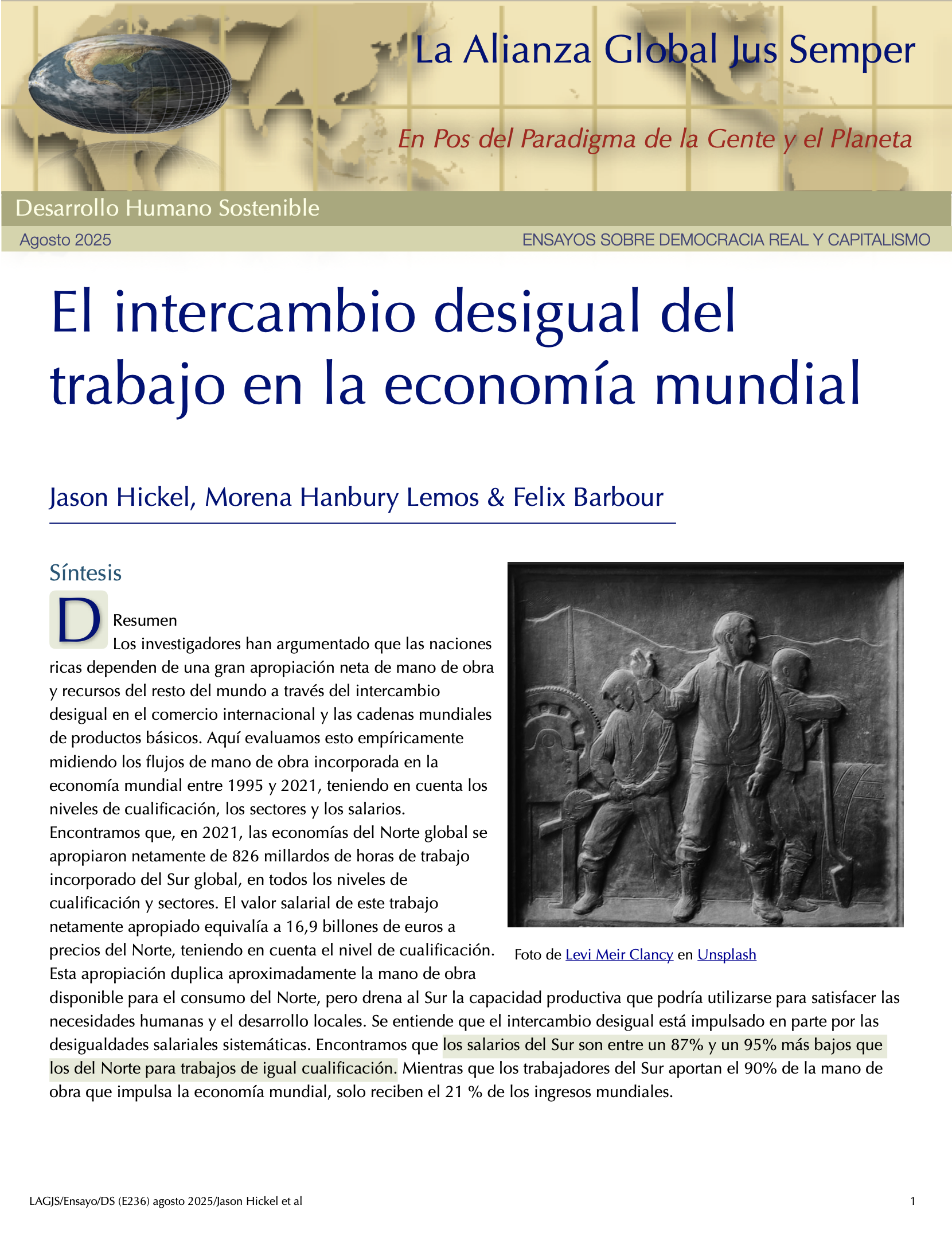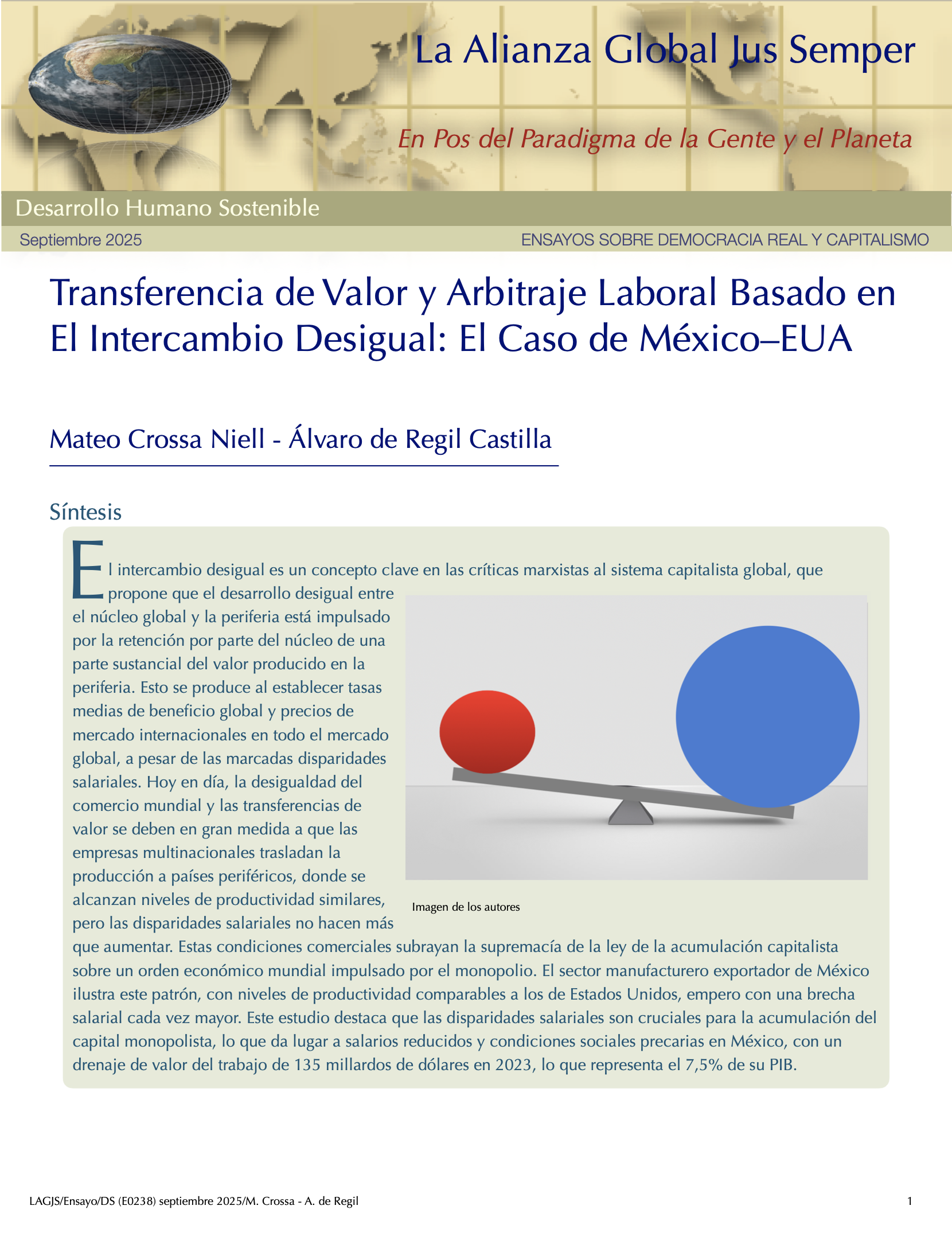 El intercambio desigual es un concepto clave en las críticas marxistas al sistema capitalista global, que propone que el desarrollo desigual entre el núcleo global y la periferia está impulsado por la retención por parte del núcleo de una parte sustancial del valor producido en la periferia. Esto se produce al establecer tasas medias de beneficio global y precios de mercado internacionales en todo el mercado global, a pesar de las marcadas disparidades salariales. Hoy en día, la desigualdad del comercio mundial y las transferencias de valor se deben en gran medida a que las empresas multinacionales trasladan la producción a países periféricos, donde se alcanzan niveles de productividad similares, pero las disparidades salariales no hacen más que aumentar. Estas condiciones comerciales subrayan la supremacía de la ley de la acumulación capitalista sobre un orden económico mundial impulsado por el monopolio. El sector manufacturero exportador de México ilustra este patrón, con niveles de productividad comparables a los de Estados Unidos, empero con una brecha salarial cada vez mayor. Este estudio destaca que las disparidades salariales son cruciales para la acumulación del capital monopolista, lo que da lugar a salarios reducidos y condiciones sociales precarias en México, con un drenaje de valor del trabajo de 135 millardos de dólares en 2023, lo que representa el 7,5% de su PIB.