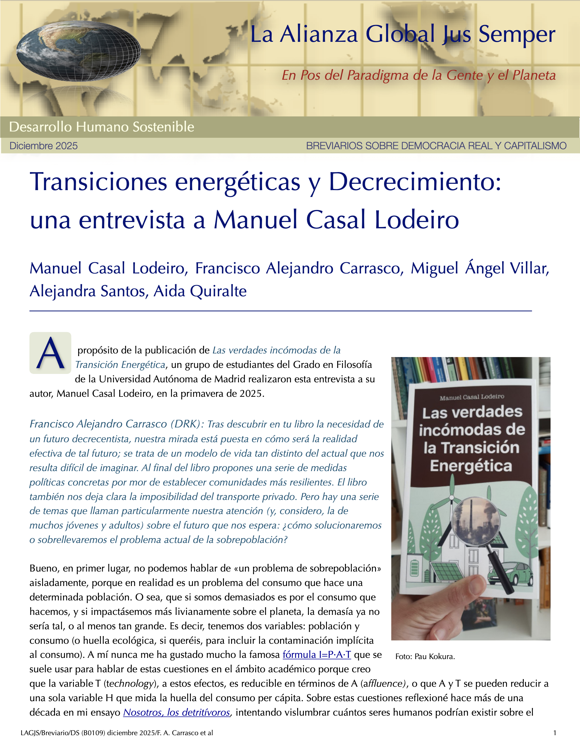 Necesitamos nuevas instituciones políticas y económicas que den prioridad a la estabilidad a largo plazo de nuestra biosfera, así como a las preocupaciones económicas de los trabajadores de todo el mundo. Y para llegar a ello, tendremos que comprender mejor la compleja relación entre la sociedad, la energía y la tecnología; es decir, comprender cómo las acciones de las instituciones sociales que rigen nuestras vidas afectan a las dinámicas energéticas y tecnológicas que, cada vez más, rigen la ecosfera global.