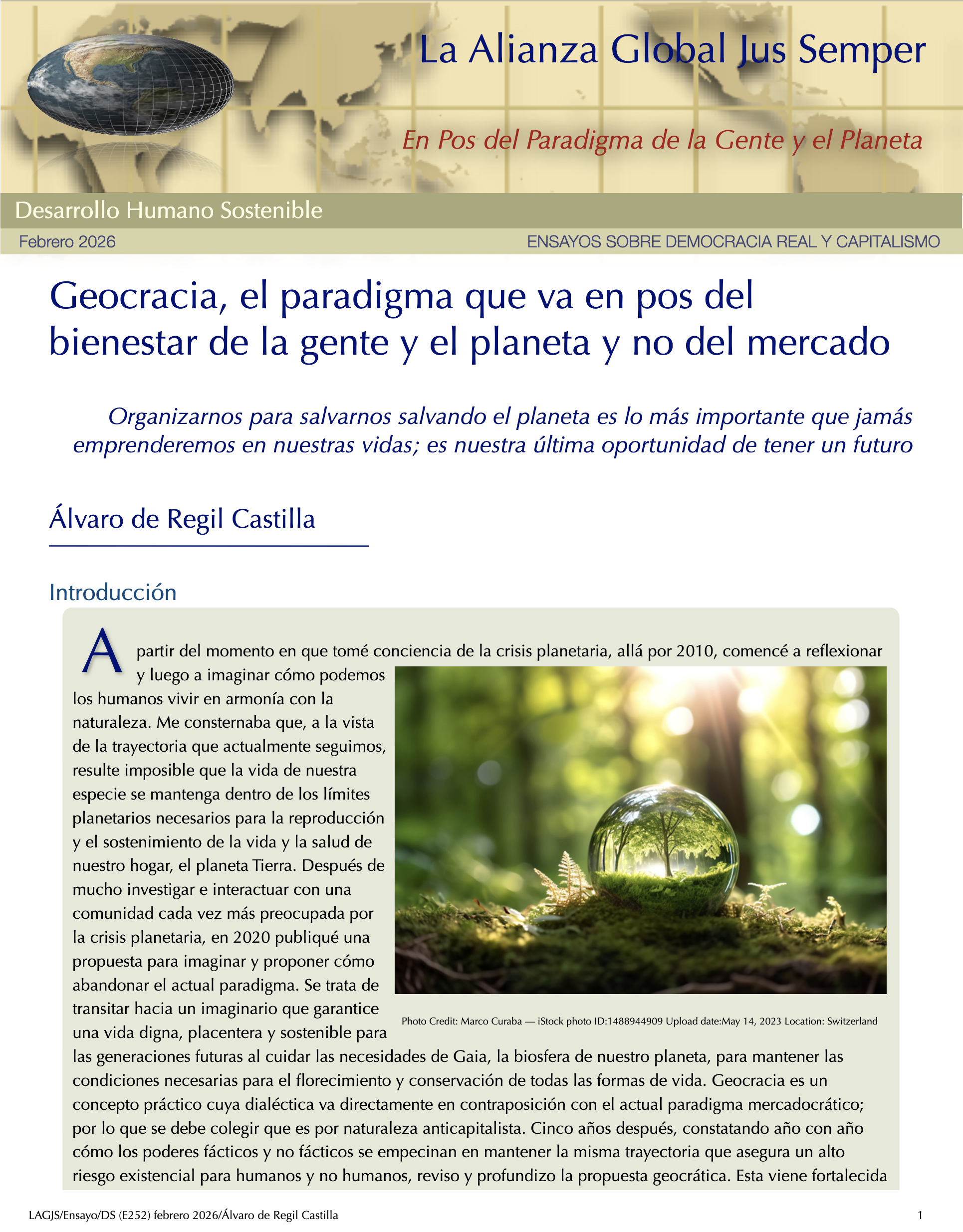 Este ensayo se basa en el paradigma geocrático que vengo desarrollando desde 2020, que propone reorganizarnos para cuidar a nuestro planeta porque, para cuidar de nosotros, es necesario anteponer las necesidades del planeta a las nuestras. La última versión recién publicada de Geocracia se encuentra aquí.